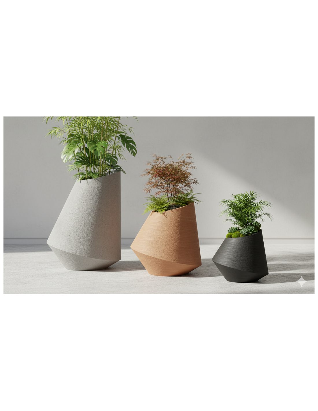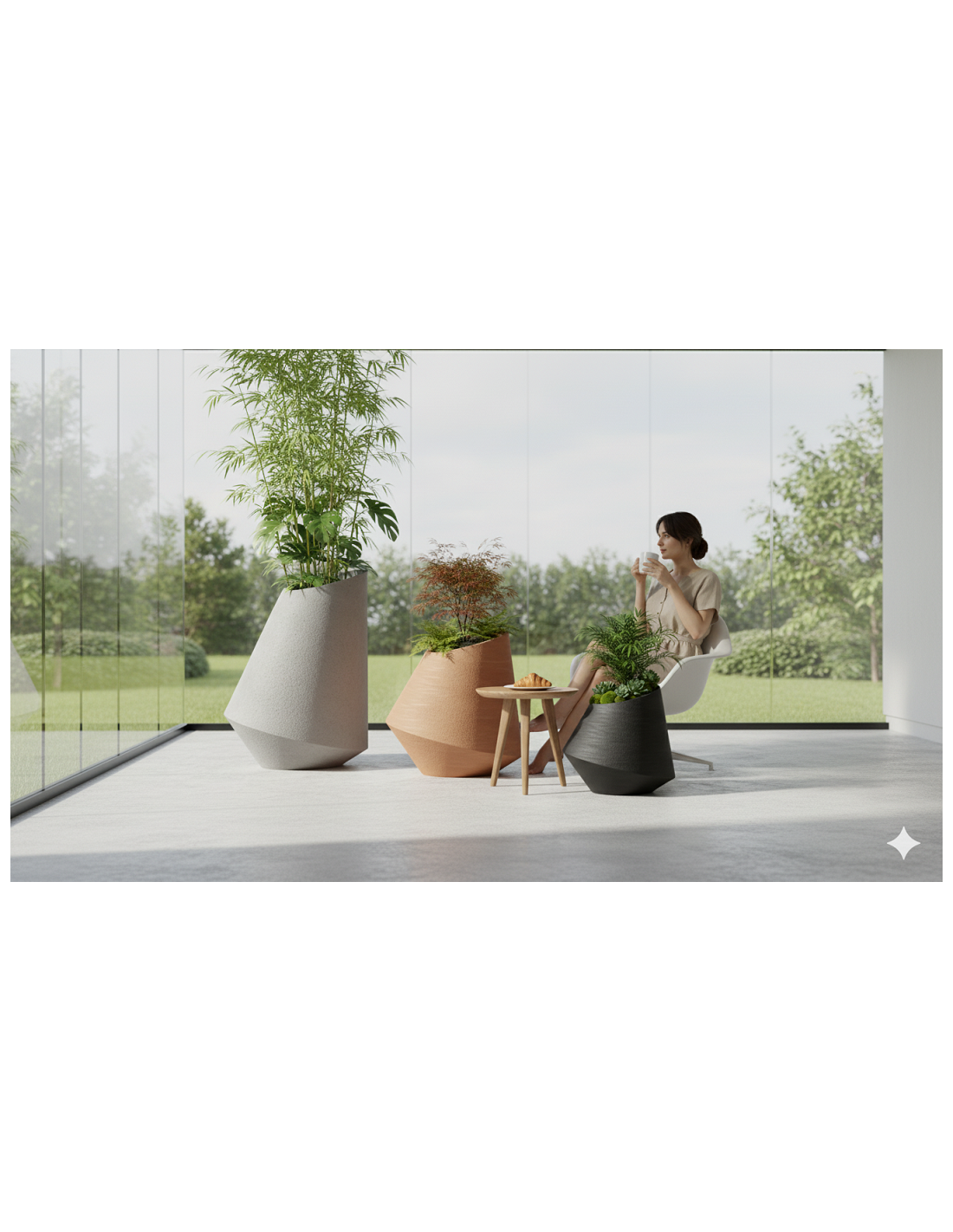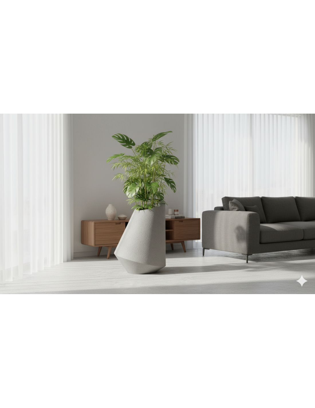 Leur géométrie asymétrique élégante crée une présence artistique dans tout espace : terrasses, halls, jardins ou intérieurs contemporains. La texture naturelle du béton met en valeur la plante, transformant chaque composition en véritable œuvre d’art.