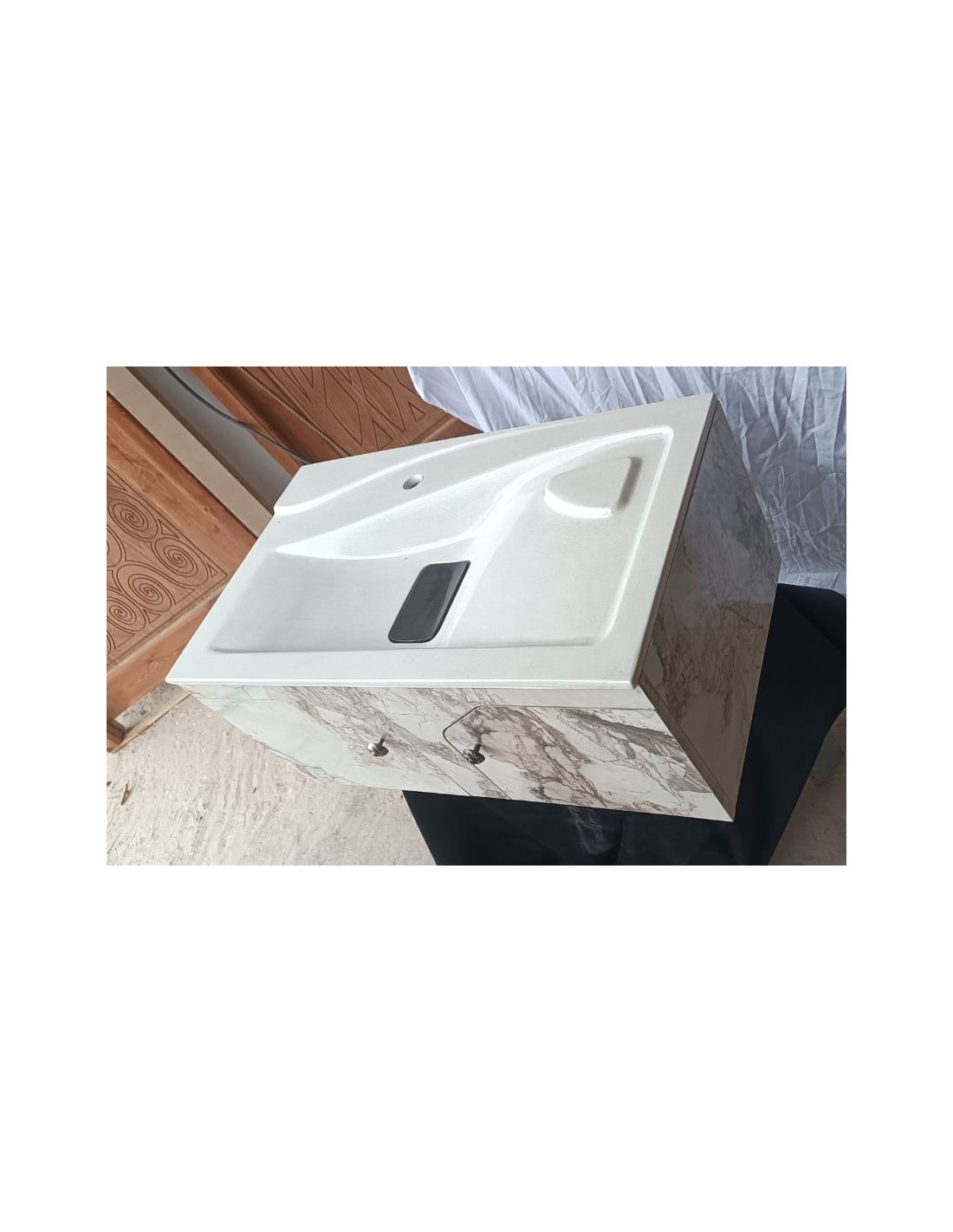 La vasque est accompagnée d’un meuble suspendu effet marbre noir, apportant une touche élégante et luxueuse à votre salle de bain. Ce meuble, robuste et pratique, est équipé de rangements fonctionnels et d’un design inspiré des tendances contemporaines.